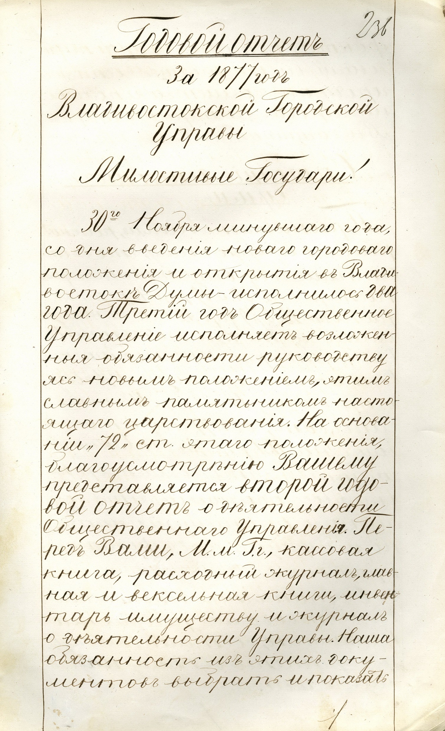 30 ноября (12 декабря по н.с.) 1875 г. состоялось первое заседание Владивостокской городской думы. На нем обсуждали вопросы: об утверждении сметы доходов и расходов на 1876 г.; о составлении инструкций городской управе; о приобретении дома для размещения городской управы и полиции; о приобретении пожарной помпы и строительстве городских колодцев и др.