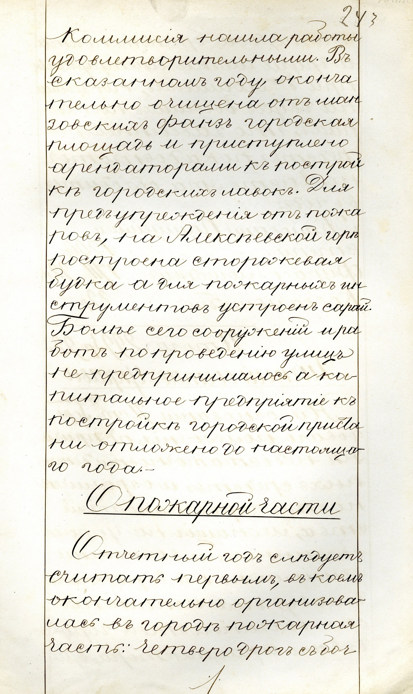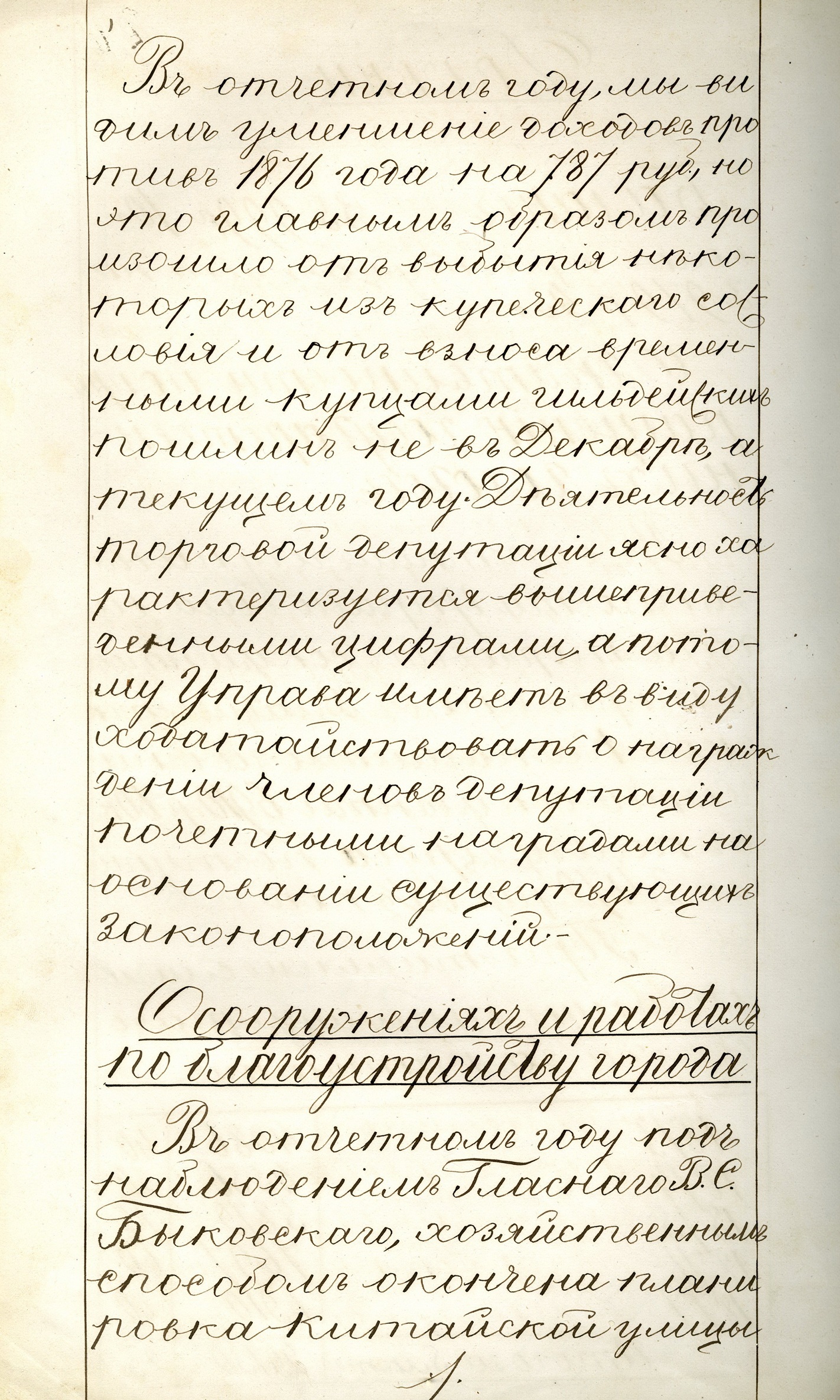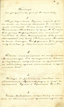В первый же 1875 г. своей работы подняла вопрос о реконструкции центральной улицы города – Светланской. На заседании в 1884 г. гласными было решено закупить в Германии 100 керосиновых фонарей для ночного освещения центральных улиц города, а на заседании 6 марта 1885 г. – решение о сооружении первых тротуаров.